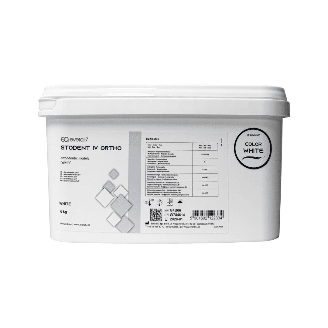 Gipsy ortodontyczny Stodent IV Ortho to supertwardy gips typu 4 przeznaczony do wykonywania wyjątkowo gładkich modeli, charakteryzujących się wysoką trwałością wymaganą w zastosowaniach ortodontycznych. Biały kolor gipsu pozwala na uzyskanie optymalnej estetyki podczas projektowania aparatów ortodontycznych.